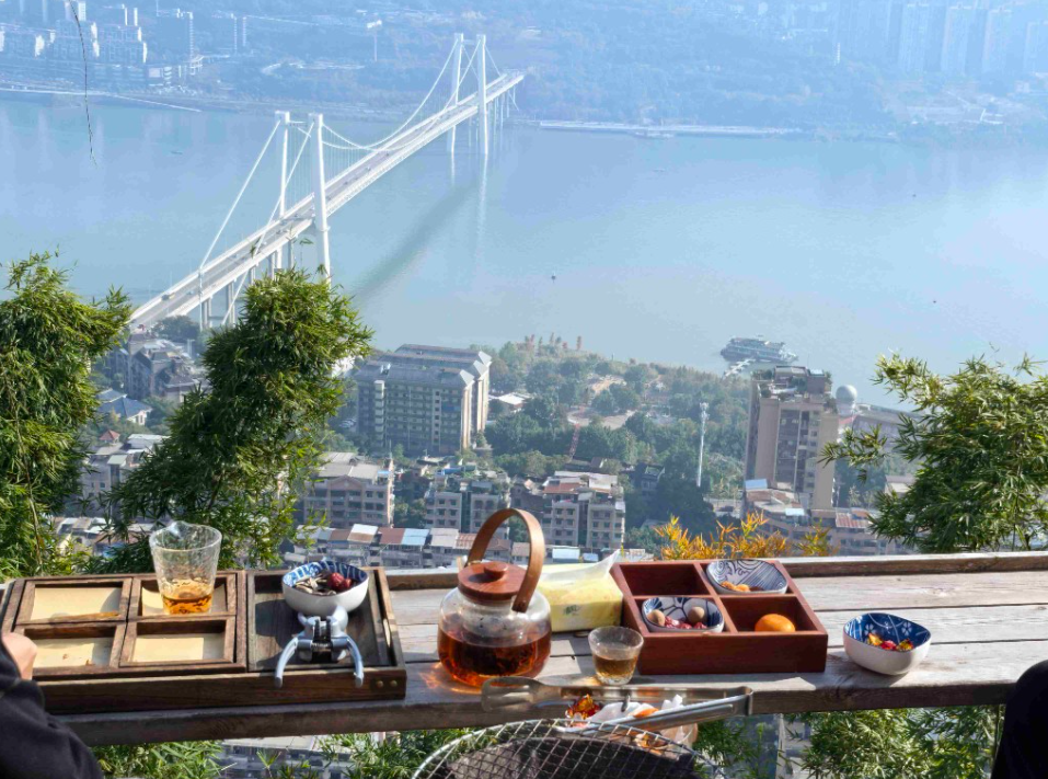 不同经营者各展巧思:“半句多”将茶桌设在视野最佳的山脊处,客人落座就能直面长江夕阳,再搭配轻柔音乐与暖光灯饰,浪漫温馨的氛围扑面而来;“向云端”用碎石铺就步道,不同区域设计了各异的装饰与格调,还穿插着莫奈花园打卡点、登云梯等景观,让客人沉浸式感受自然松弛感;“山也晚集”则在保留老房子与周边树木原貌的基础上,融入当代美学意境,不仅有墨香四溢的崖边书屋,更打造了270°品茗观景台,让山水与人文相得益彰。