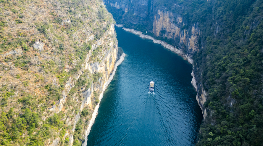 一艘游船从巫山县城方向驶来,在碧绿的江面上划出白色尾流,从巨大的“鱼嘴”旁轻盈穿过。一动一静,相映成趣,仿佛正从鱼头湾“游”进春天里。熊威摄