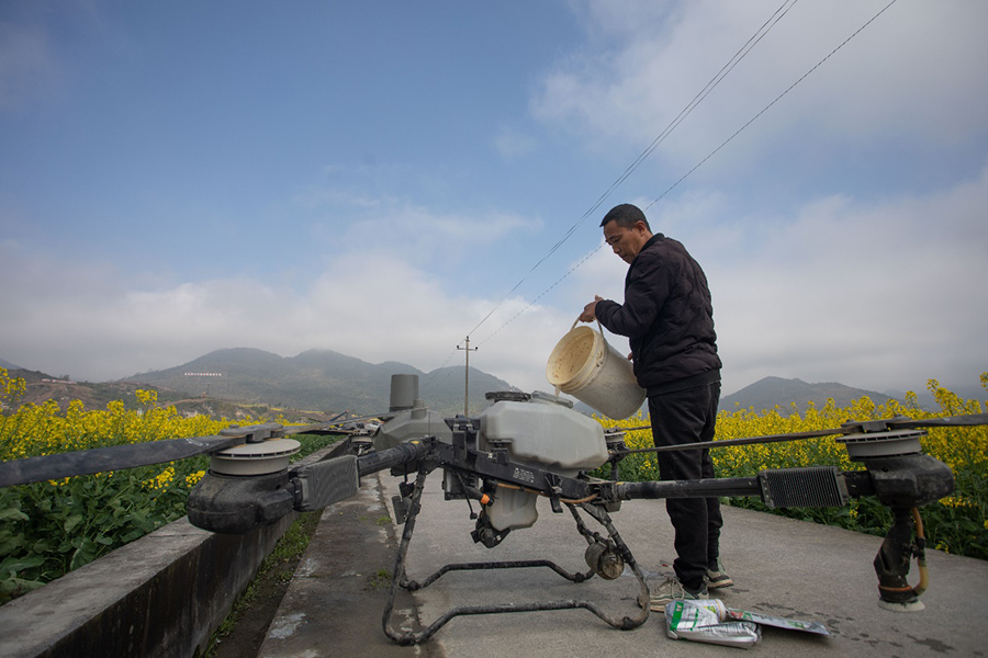 秀山县清溪场街道油菜种植基地,一位种植大户正在给植保无人机填装药剂。胡程 摄