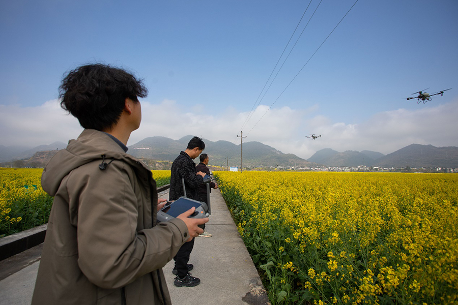 3月10日,在重庆市秀山县清溪场街道油菜种植基地,种植大户们操作植保无人机开展田管作业。胡程摄胡程 摄