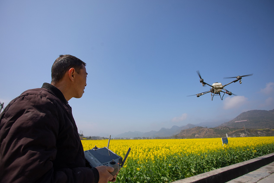 秀山县清溪场街道油菜种植基地,一位种植大户正在操作植保无人机开展田管作业。胡程 摄